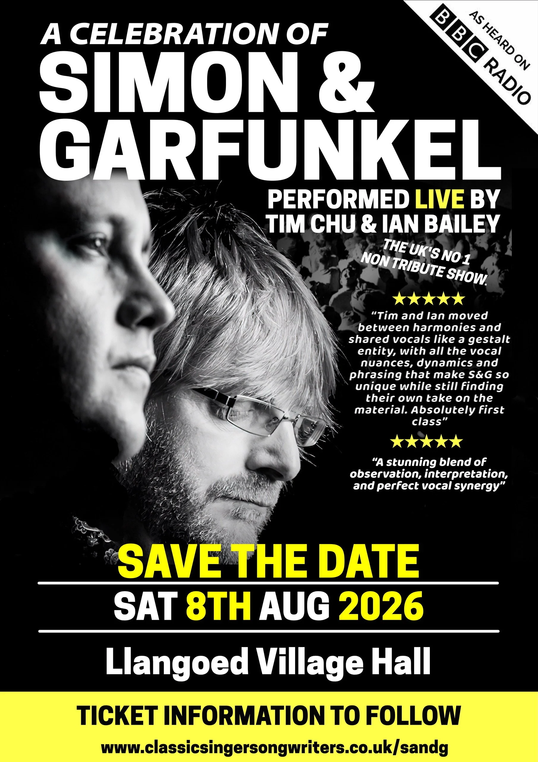 “A Celebration of Simon & Garfunkel” is a touring acoustic concert by singer-songwriters Tim Chu and Ian Bailey that lovingly revisits the timeless songs of the legendary duo in an intimate, stripped-back setting. Rather than a costume tribute, the show offers thoughtful interpretations of Simon & Garfunkel’s classic catalogue, blending rich vocal harmonies and two guitars to create a warm, nostalgic atmosphere for audiences of all ages.